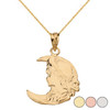 Art Nouveau Lady in Crescent Moon Pendant Necklace in Solid Gold (Yellow/Rose/White)